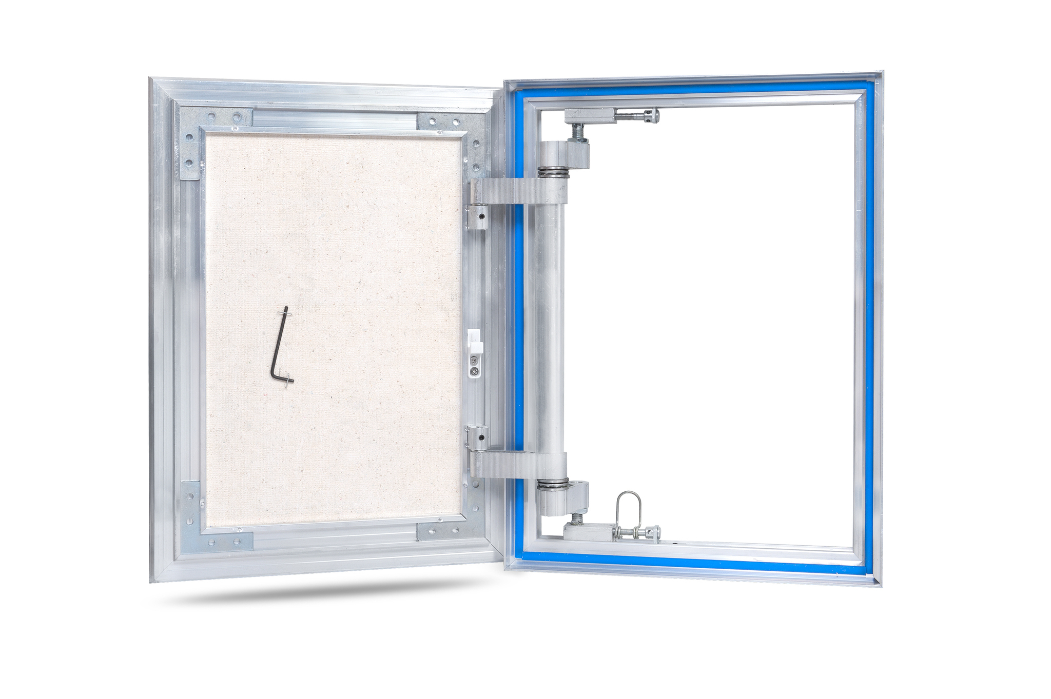 Дверца люка из алюминиевого профиля с видимыми ребрами жесткости, толщина стенок ответственных мест 2 мм, профиль выполнен Г-образной формой с завальцовкой на ГВЛ/ГКЛВ, для захвата его по всему периметру, а не только в местах заклепок/саморезов.