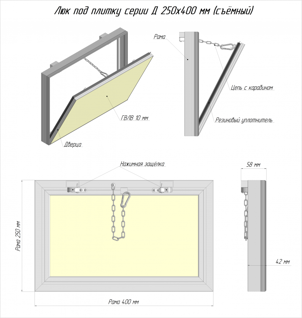 Люк серии Д (доступ) - люк под плитку со съемной дверцей предназначен для установки в места с ограниченным доступом, где люк с петлевым механизмом невозможно установить.