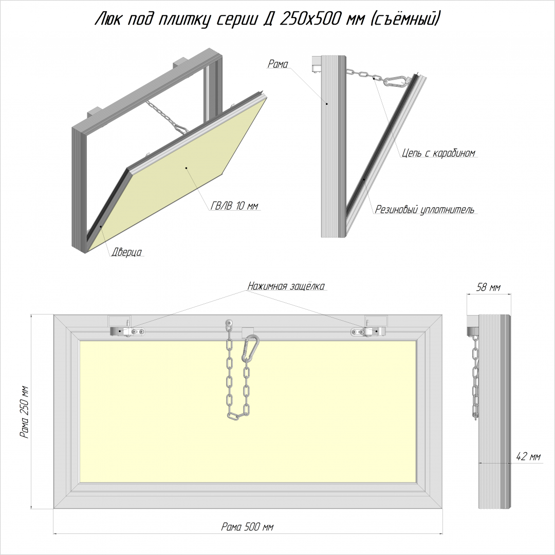 Люк серии Д (доступ) - люк под плитку со съемной дверцей предназначен для установки в места с ограниченным доступом, где люк с петлевым механизмом невозможно установить.