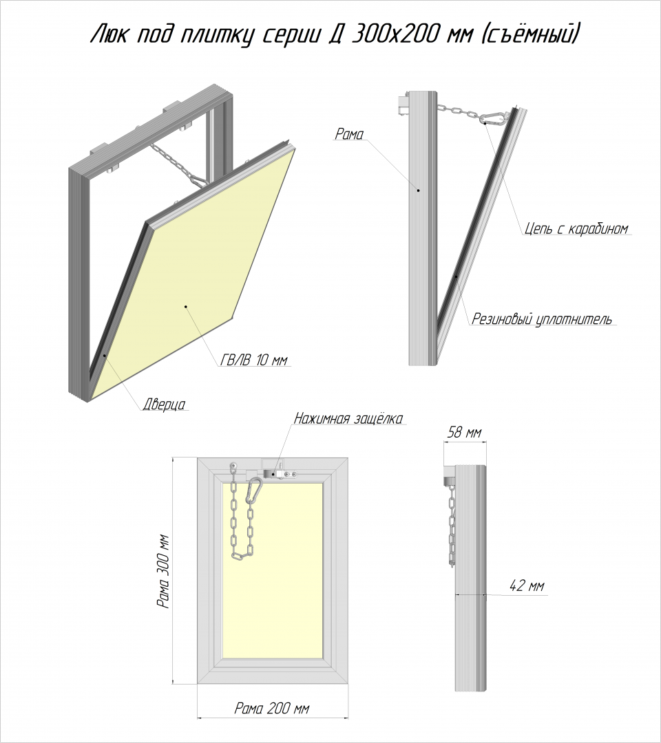 Люк серии Д (доступ) - люк под плитку со съемной дверцей предназначен для установки в места с ограниченным доступом, где люк с петлевым механизмом невозможно установить.
