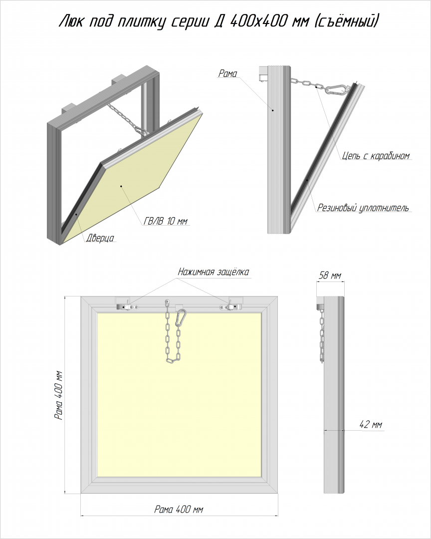 Люк серии Д (доступ) - люк под плитку со съемной дверцей предназначен для установки в места с ограниченным доступом, где люк с петлевым механизмом невозможно установить.