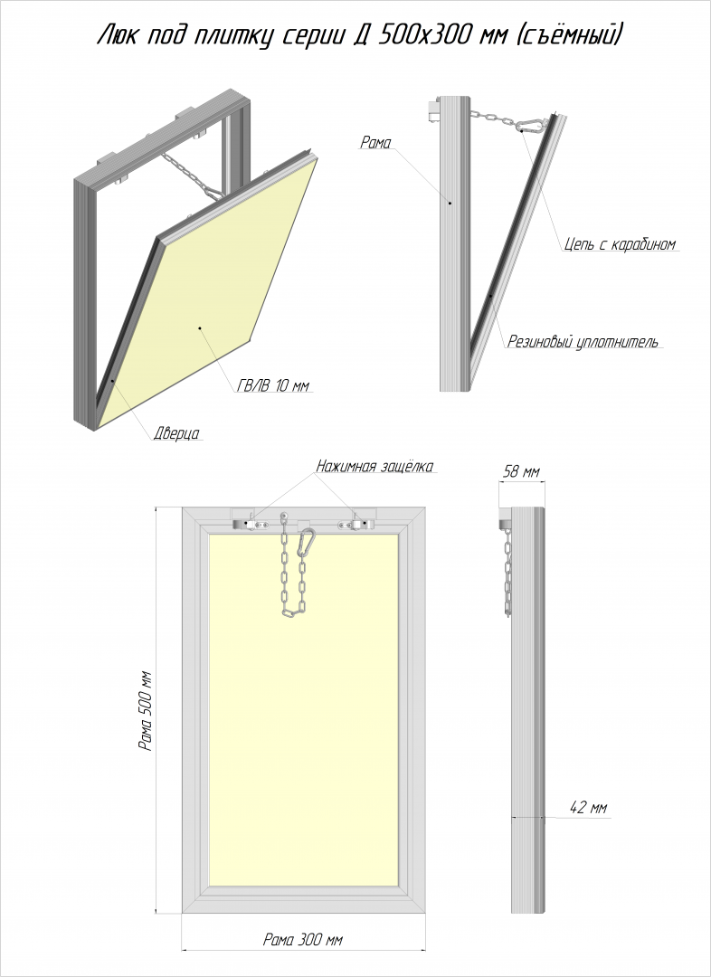 Люк серии Д (доступ) - люк под плитку со съемной дверцей предназначен для установки в места с ограниченным доступом, где люк с петлевым механизмом невозможно установить.