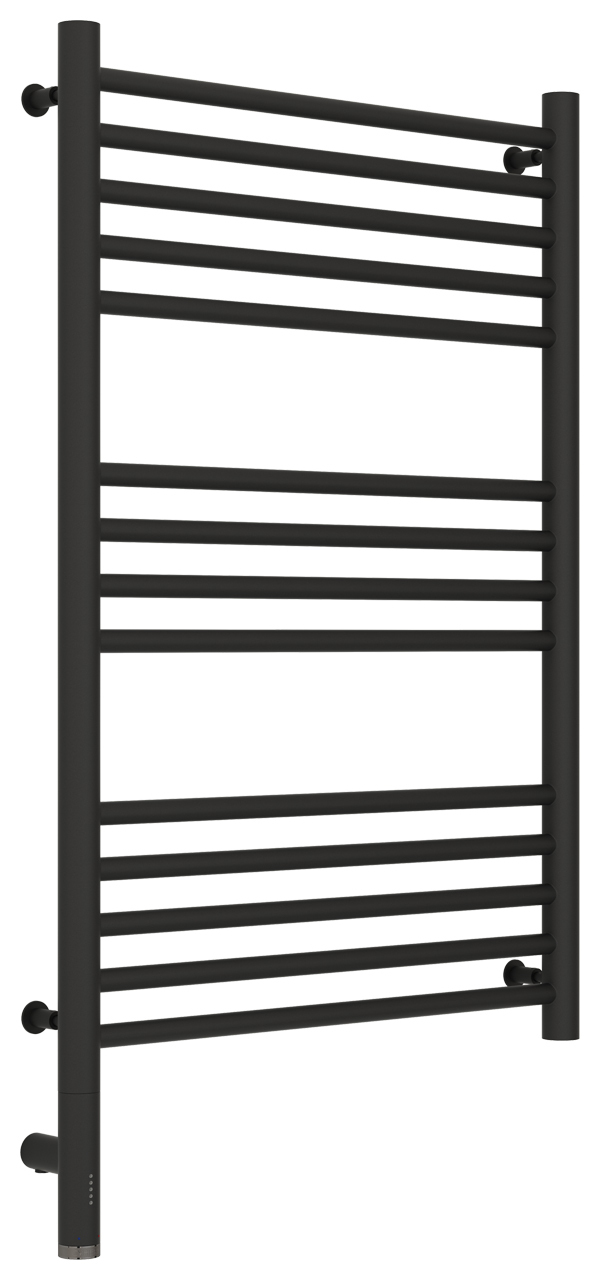 Управление происходит с помощью эстетичного поворотно-нажимного элемента – он позволяет регулировать температуру в диапазоне от 40 до 60°С, выставлять таймер отключения прибора и переводить полотенцесушитель в режим экстра сушки.