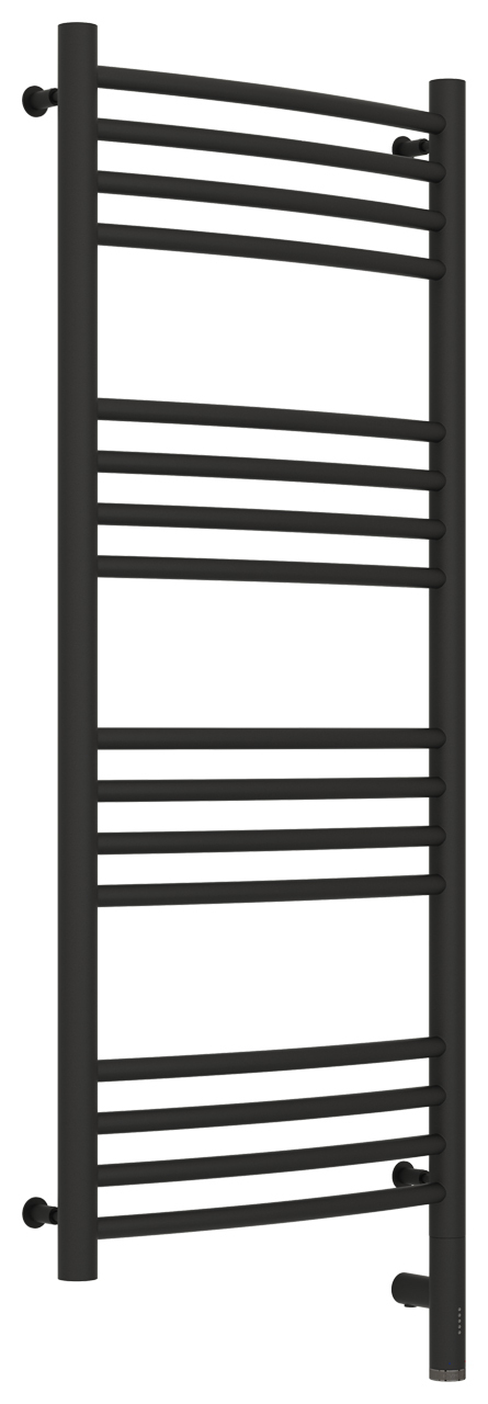 Управление происходит с помощью эстетичного поворотно-нажимного элемента – он позволяет регулировать температуру в диапазоне от 40 до 60°С, выставлять таймер отключения прибора и переводить полотенцесушитель в режим экстра сушки.